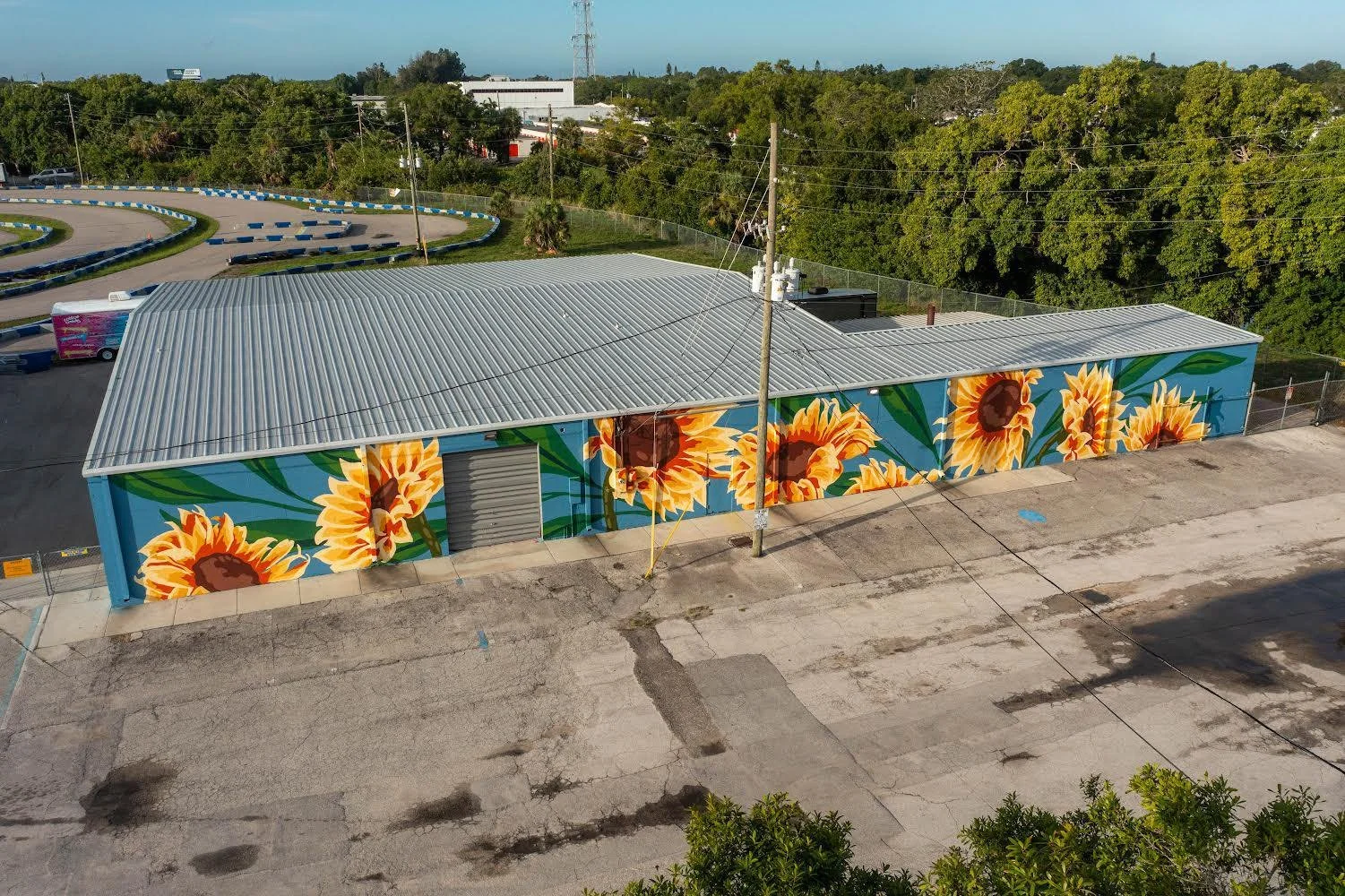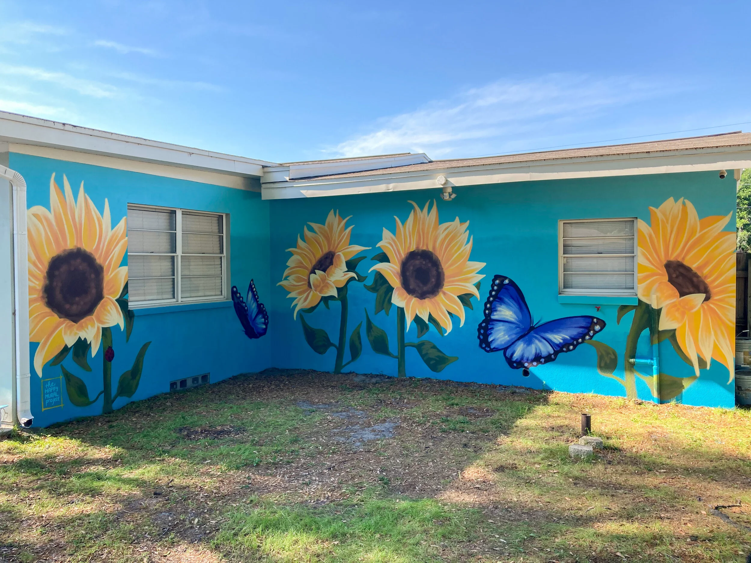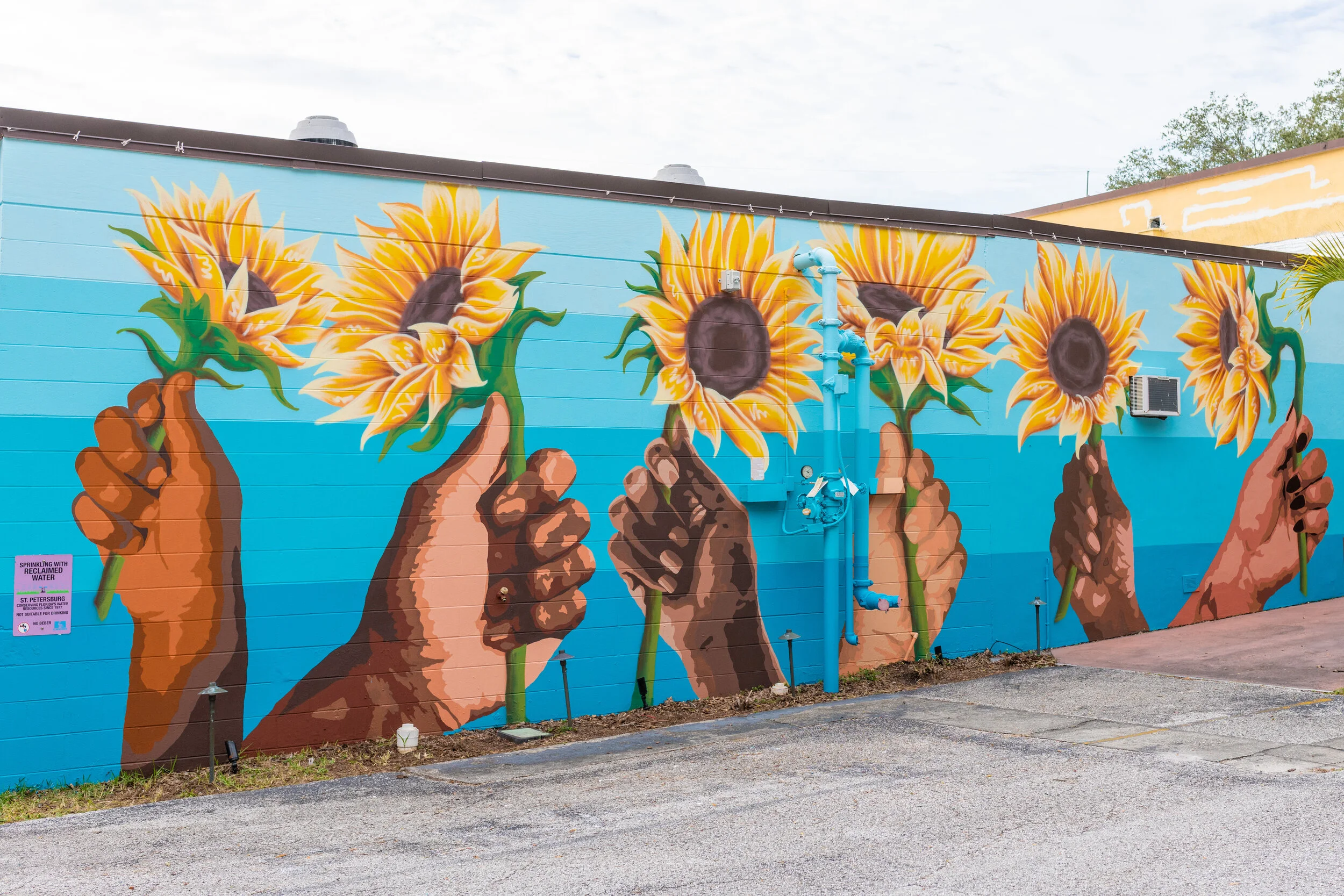 This wall was a color-by-number community mural! Hundreds of members of sweet Saint Pete came out each day for a week and plugged away at filling in shapes until the mural came together as one big collective of love. Each hand used is one from members of our community!!