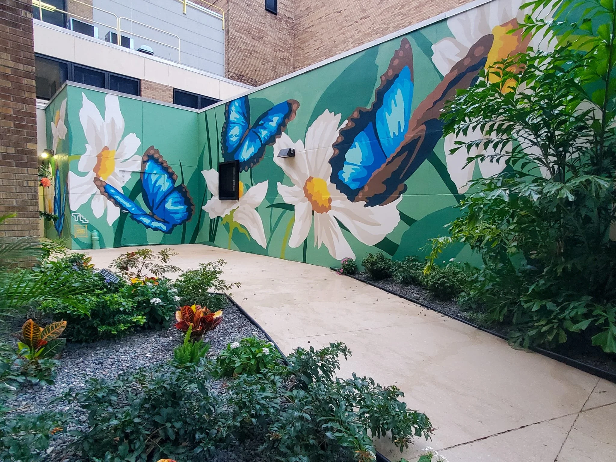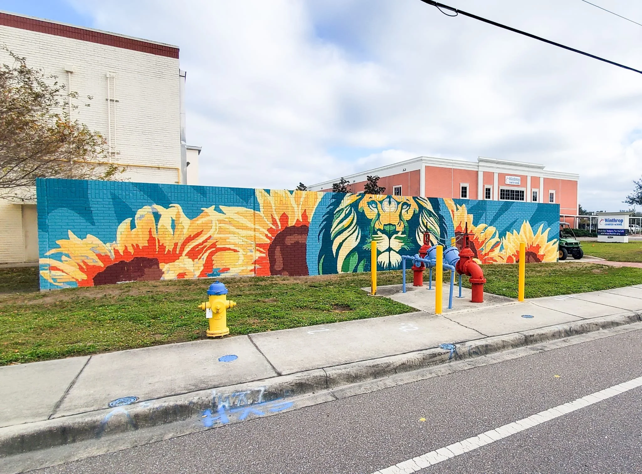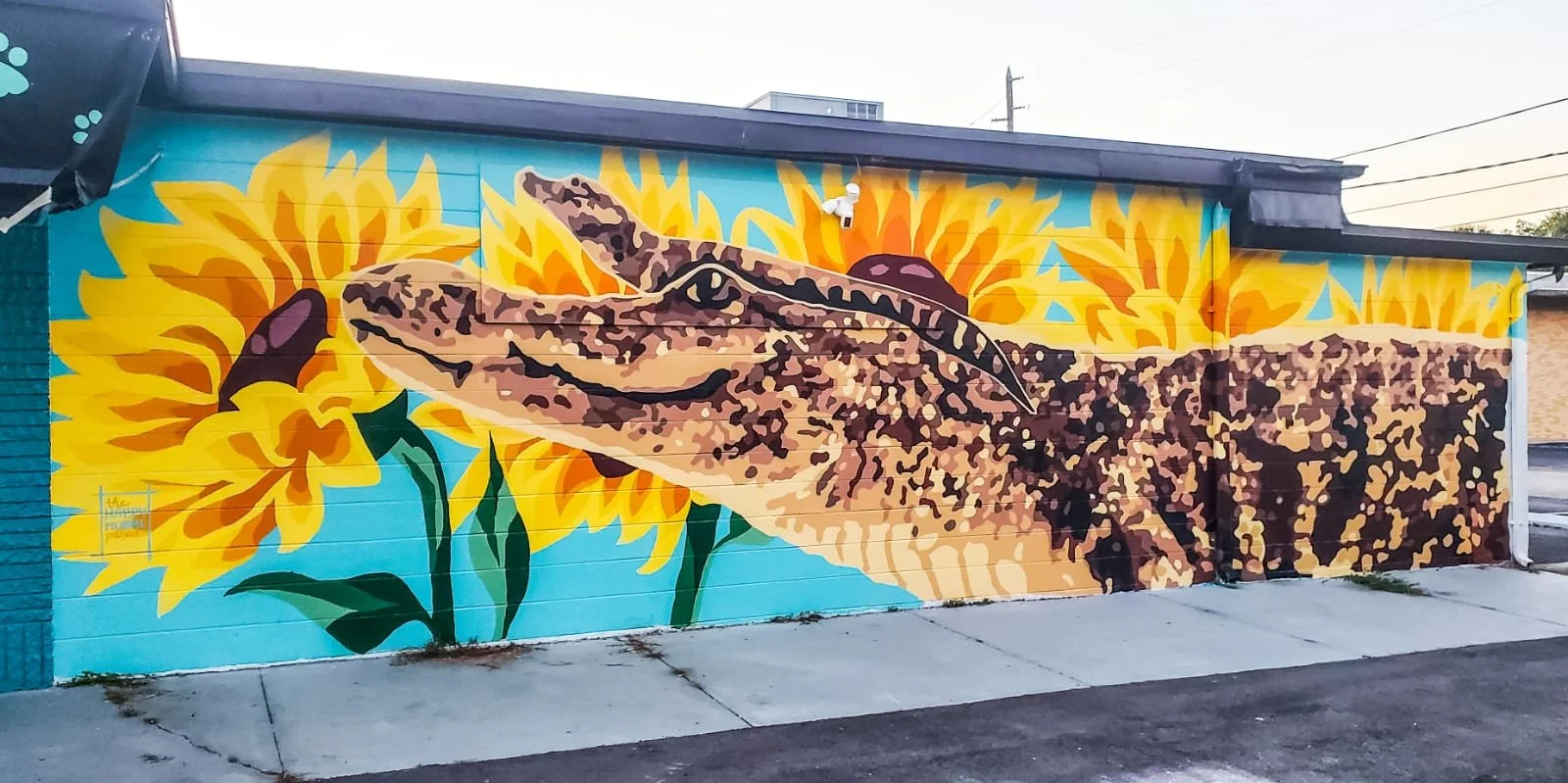 This wall was a color-by-number community mural! Hundreds of members of sweet Saint Pete came out each day for a week and plugged away at filling in shapes until the mural came together as one big collective of love. Each hand used is one from members of our community!!